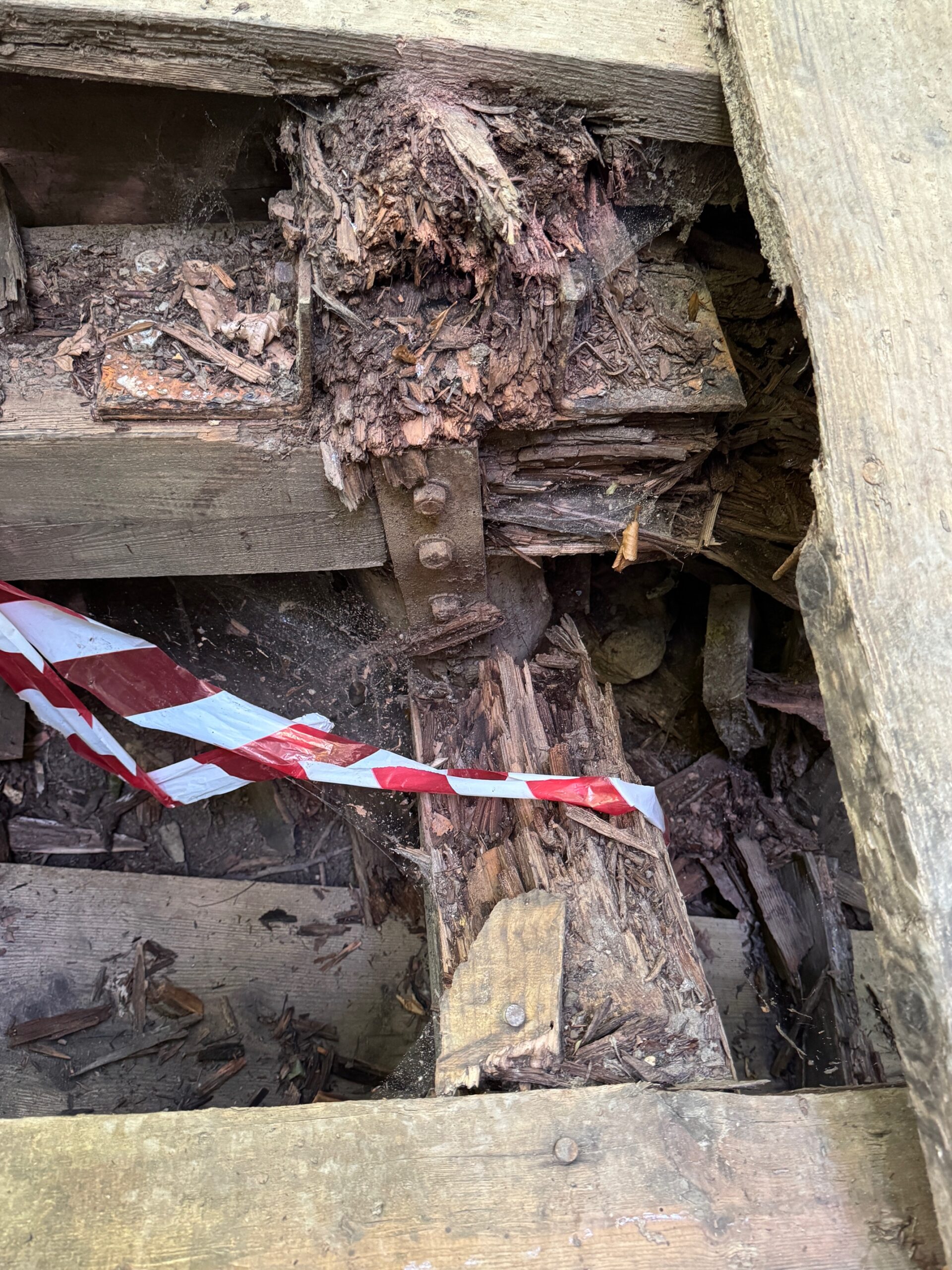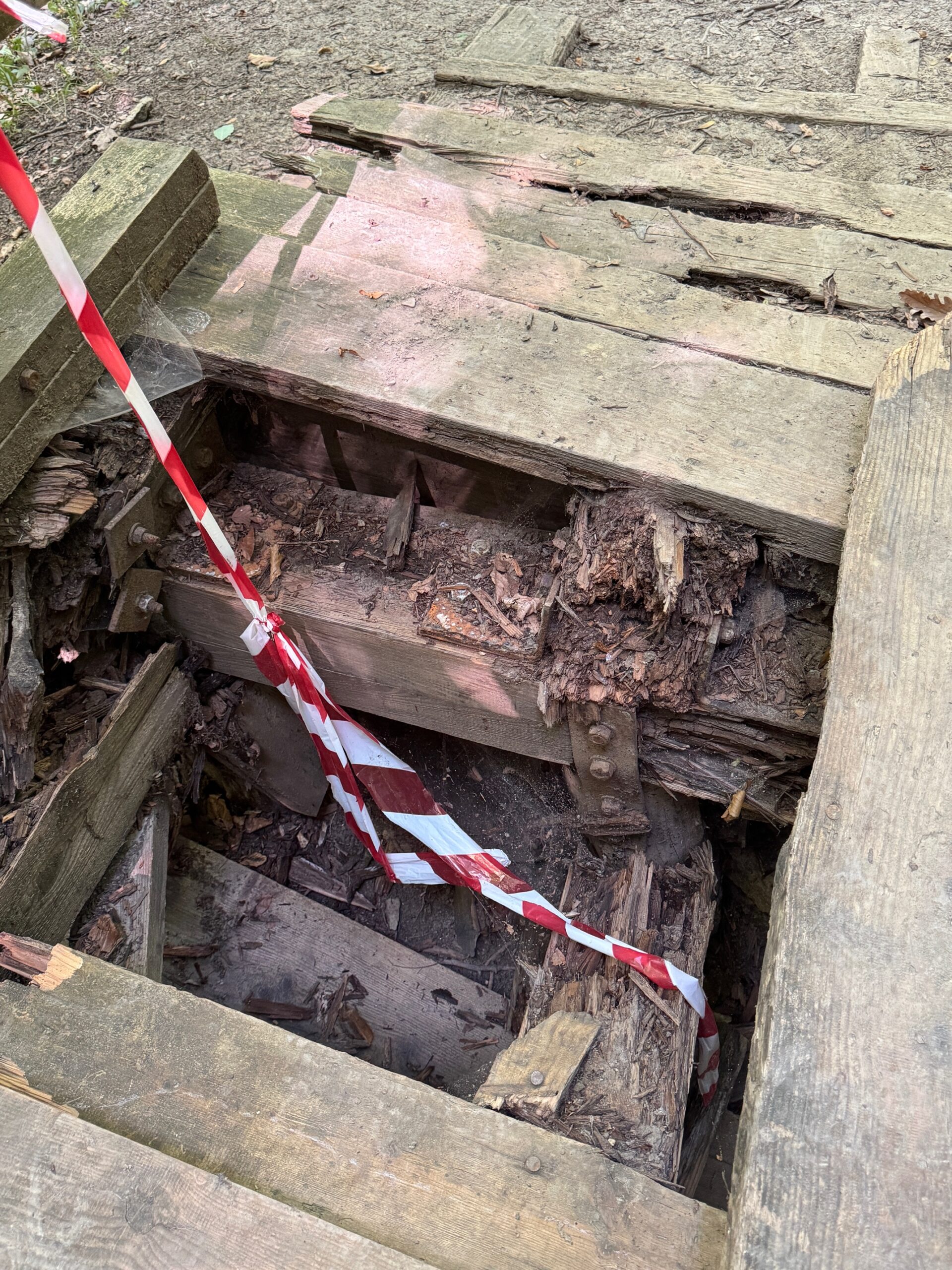 ist durch den letztjährigen Starkregen und Hochwasser und vermorschter Tragekonstruktion sehr stark beschädigt!