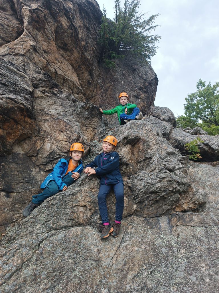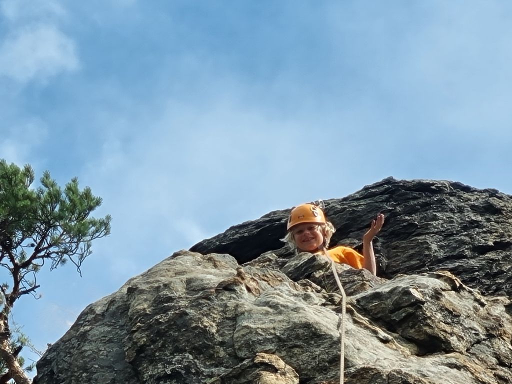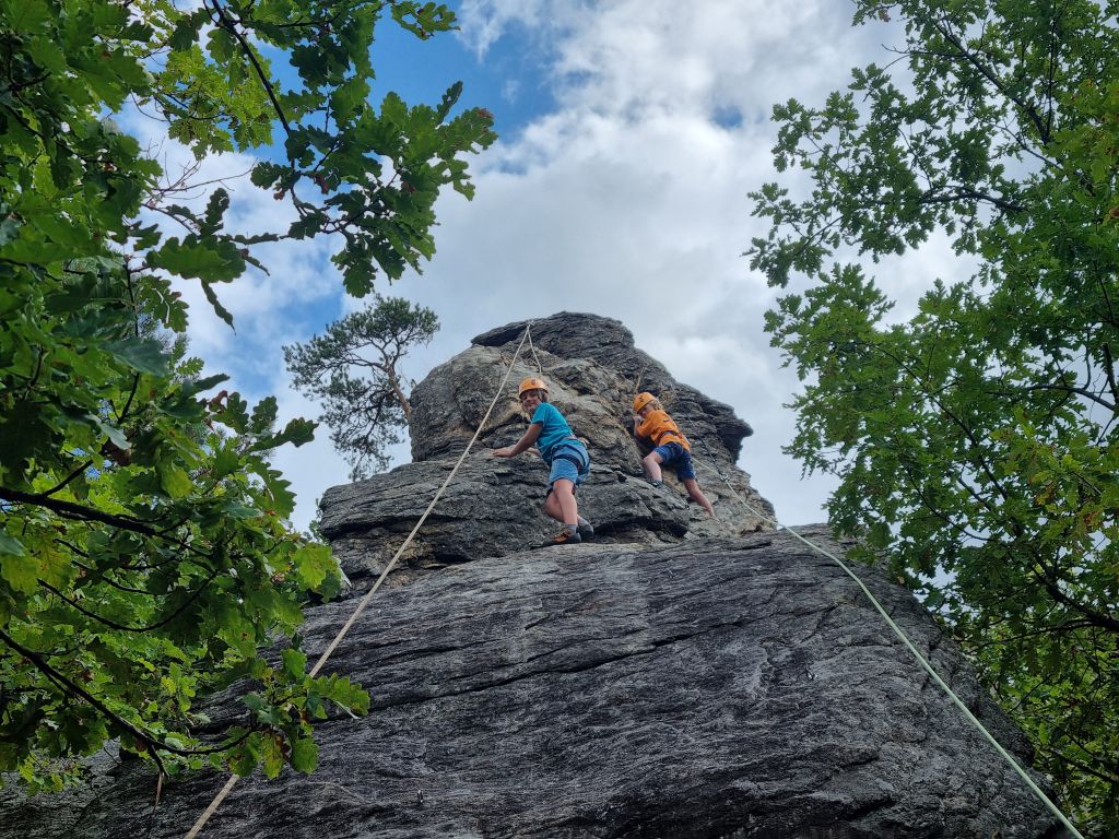 Erste Station Flammenplatte und Spiegel: Ratz, fatz waren die Routen eingerichtet und sowohl die Kinder als auch die begleitenden Erwachsenen zischten über die Platten. Besonders cool fanden die Kinder von der Flammenspitze ihre Freunde und Eltern beim Spiegel sehen zu können. Auch die Aussicht war für Alt und Jung beeindruckend, wobei ich von einem unserer kleineren Kletterer sehr überrascht war, der vehement Seil forderte, um sich gemütlich hinsetzen zu können, um ins Land hineinzuschauen.