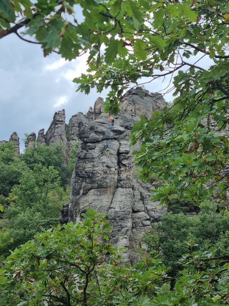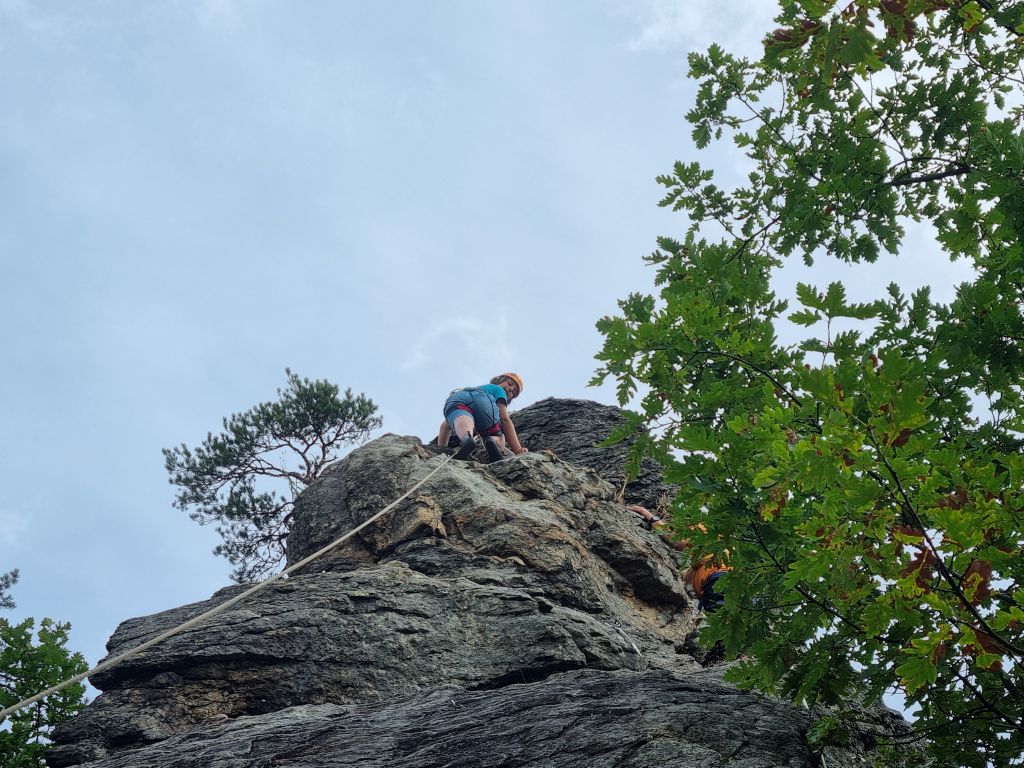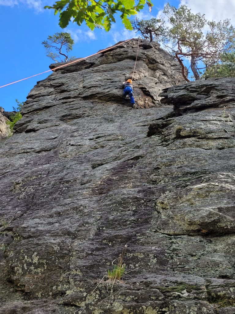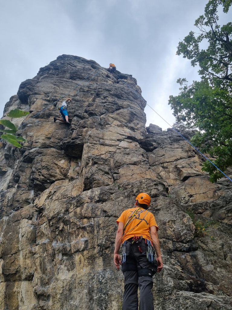 Da wir so viele waren, hat sich die Gruppe entlang der Steige rasch auf die nächsten Felsen ausgebreitet. Über Pentagonfelsen und Kreskyplatte ging es weiter bis zu den Routen auf den Däumling und den danebenliegenden Felsen – dazwischen immer wieder Jause und Pause. Nur den Omafelsen haben wir nicht bestiegen, obwohl das sicherlich coole Photos geworden wären.