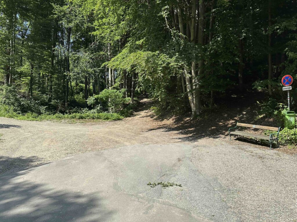 Der Weg beginnt in Kierling an der Hauptstraße (B14), wo die Otto-Kochwasser-Gasse und die Feldgasse zusammentreffen, gemeinsam mit der blauen Markierung zur Redlinger Hütte. Man überquert die Hauptstraße und wechselt in die Maitisgasse von der ein Stück weiter die Gasse Grüntal, beim Wegknoten Kierling/Grüntal bergauf abzweigt. Nach wenigen Metern trennen sich die beiden Markierungen, wobei man sich rechts hält und den Bach überquert. Von nun an folgt man der Gasse stetig bergan bis zum Ende, wo geradeaus, weiter bergauf, ein Forstweg in den Wald führt.