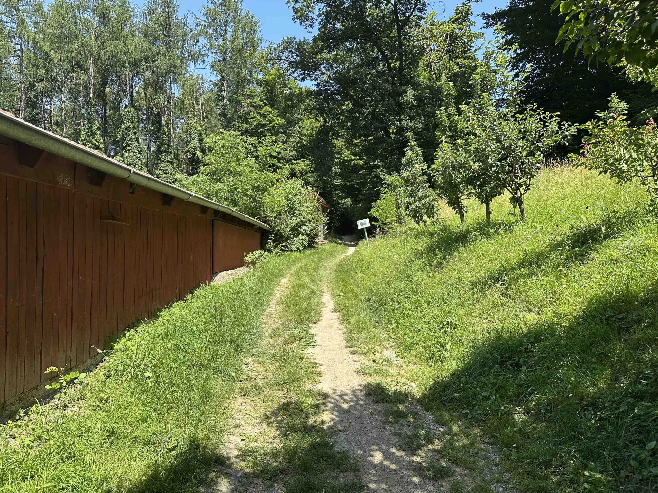 Der Weg startet bei der Redlingerhütte, einem beliebten Ausflugsziel das mit hervorragender Hausmannskost und vegetarischen Schmankerln zum Verweilen einlädt. Man folgt dem Weg in nördlicher Richtung in den Wald und hält sich bei der ersten Kreuzung links, bergab, wo man am Ende den Marbach quert und beim Wegknoten unterhalb der Redlingerhütte den rot markierten Weg vom ISTA in Gugging Richtung Heuberg kreuzt.