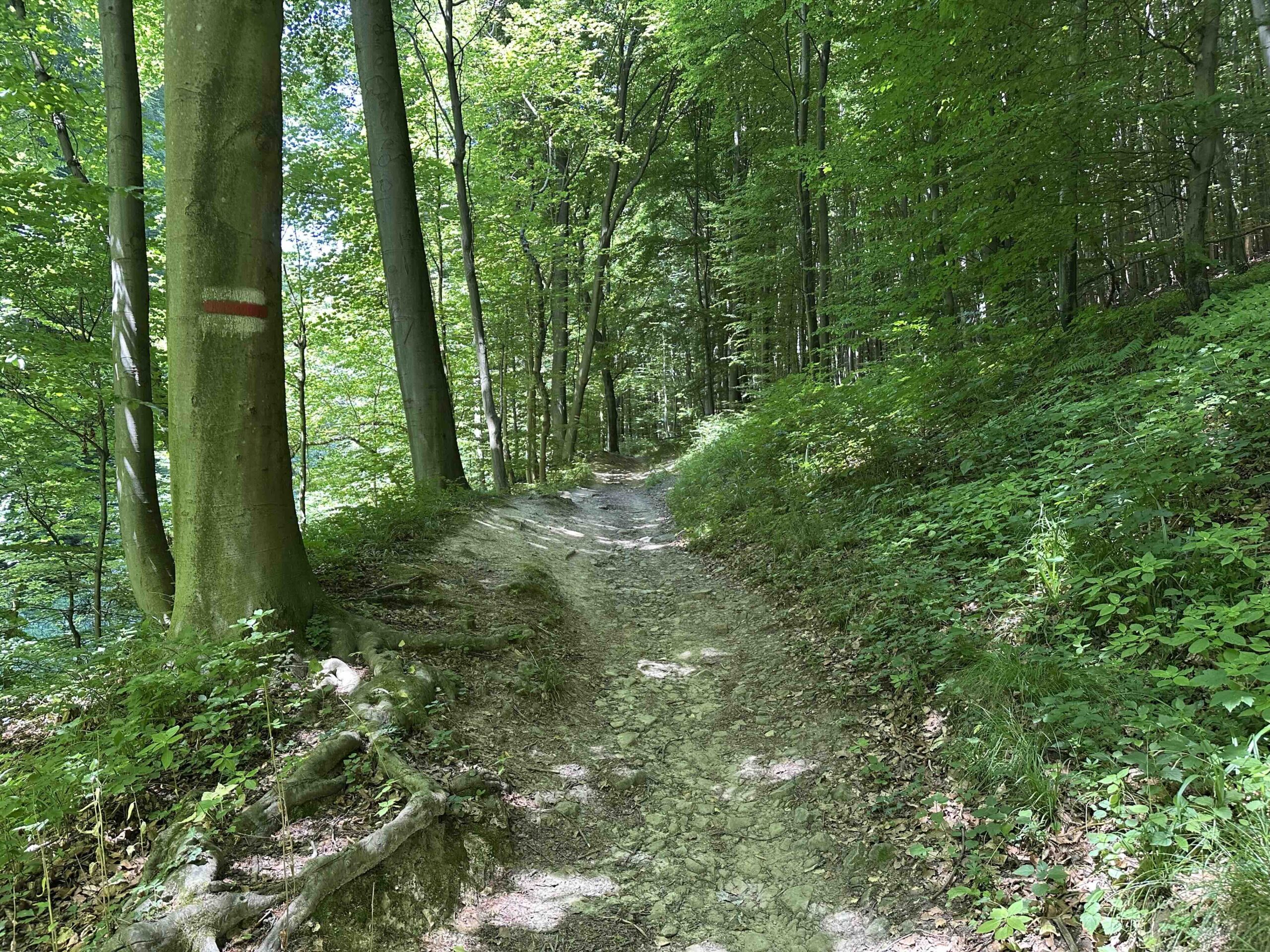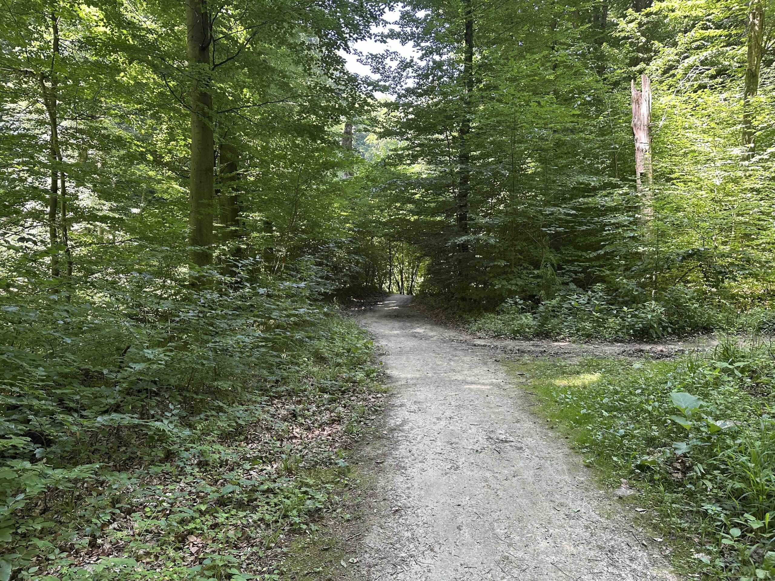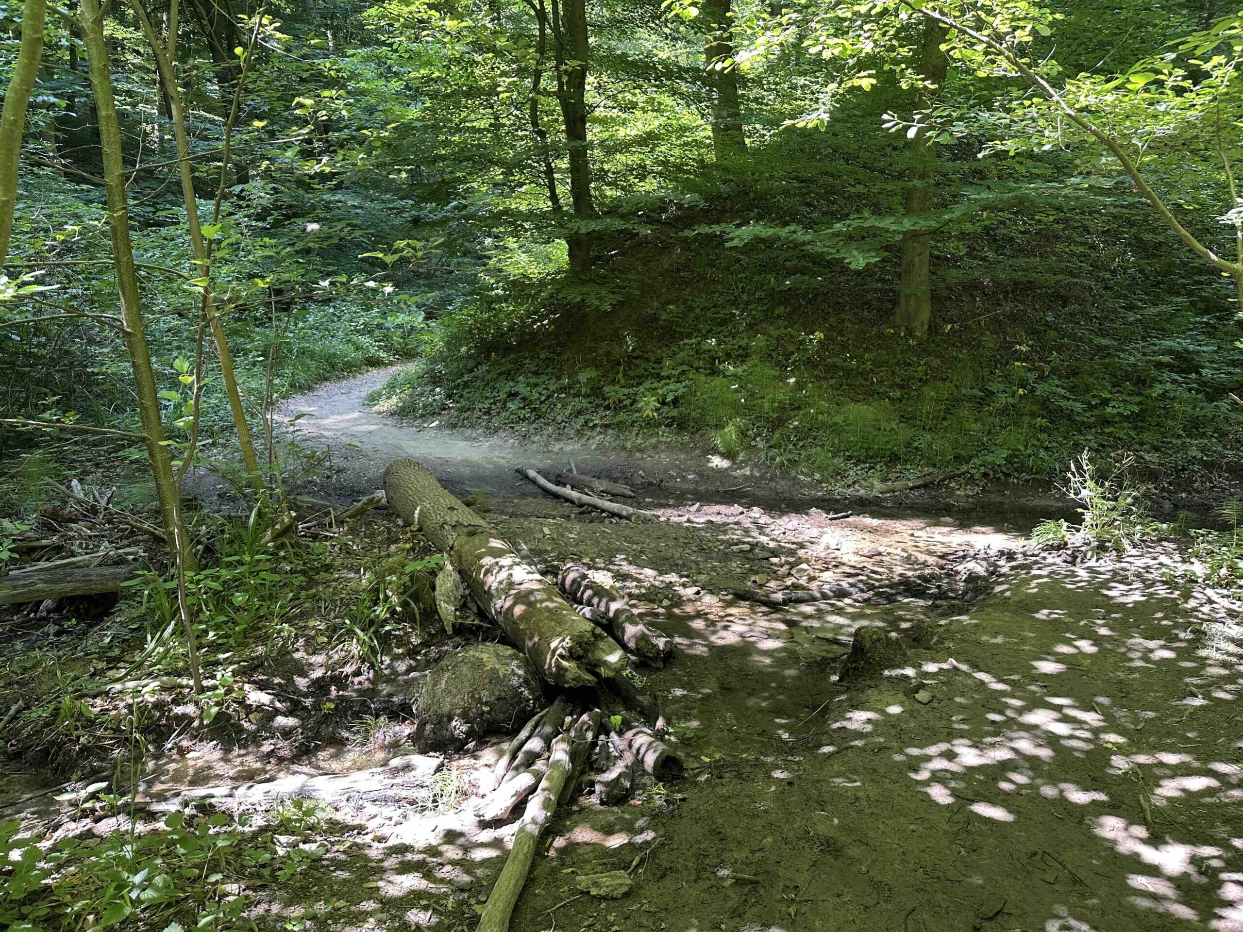 Man folgt den Weg weiter geradeaus und wandert begleitet vom Plätschern des Marbachs durch einen alten Blätterwald.