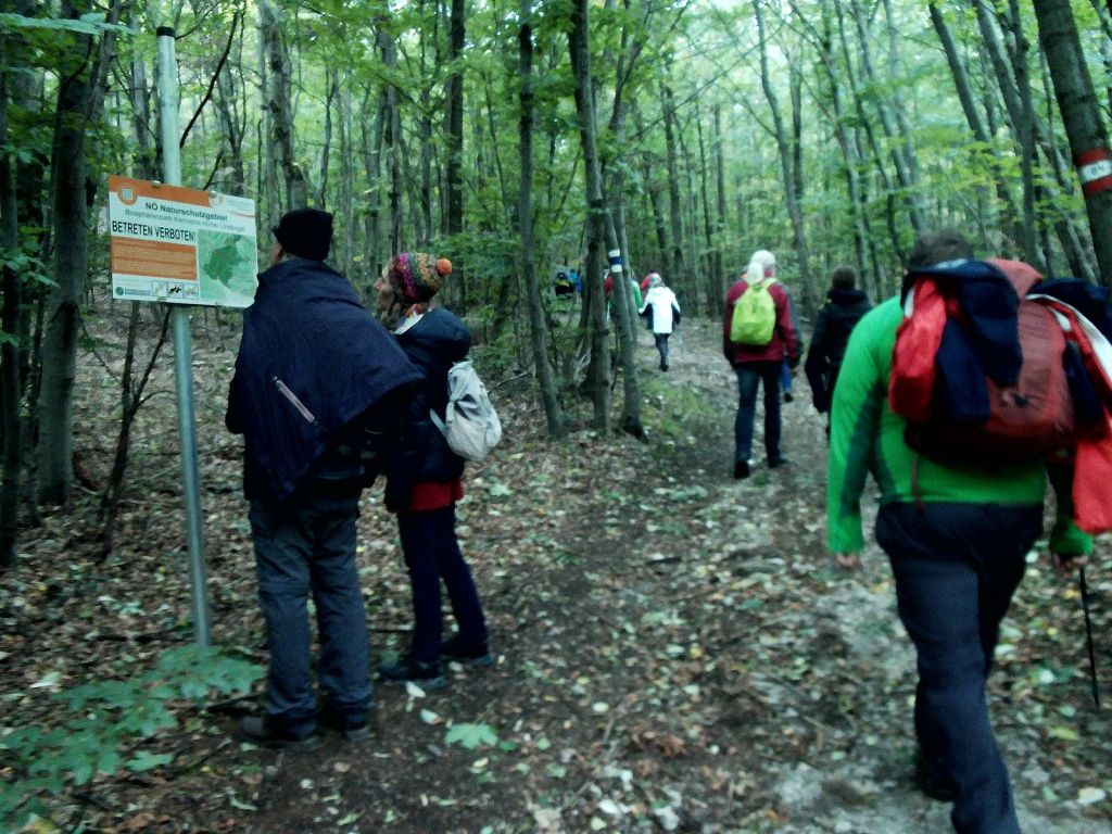Wir aus Klosterneuburg waren leider nur zu viert, da die herbstlichen Verkühlungen manchen einen Strich durch die Rechnung gemacht haben. Bequem sind wir mit dem Zug angereist und wurden liebenswerterweise von Hans und Susanna vom Bahnhof zum Gasthaus „Cholerakapelle“ im Helenental mitgenommen, da es zu dieser Uhrzeit keine Busverbindung in die Nähe gab. Der für Vormittag angesagte Sprühregen blieb aus und so starteten wir bei bedecktem Himmel aber idealem Wanderwetter auf den Hohen Lindkogel – unter den Bildern findet ihr auch eine Karte mit den Wanderrouten, falls ihr diese nachgehen wollt.