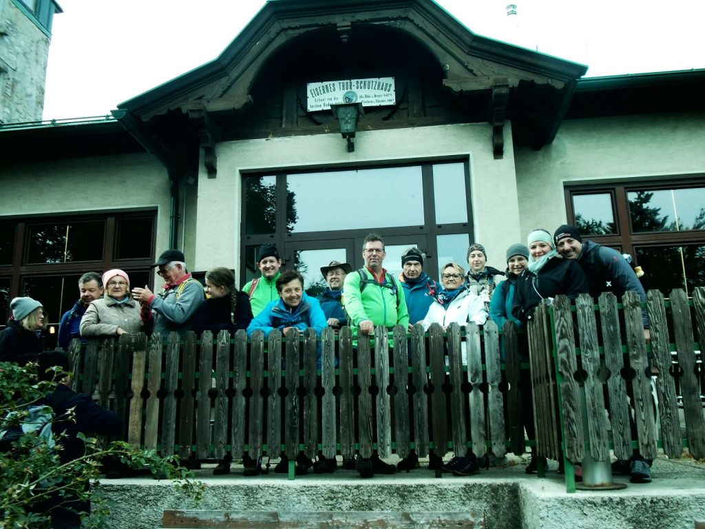 Nach der Begrüßung durch Hans ging es dann auch schon über das Brückerl auf die „richtige“ Seite der jungen Schwechat und stetig bergauf durch den Wald. Teile des Hohen Lindkogels sind Naturschutzgebiet, weshalb wir uns an die Wege hielten und in einem herbsteltend Wald, der aber noch in grüner Pracht stand langsam Höhenmeter für Höhenmeter bezwangen. Der Wienerwald scheint so lieblich, hatte aber von diesen doch 600 Höhenmeter und bäumte sich kurz vor dem Ziel als richtiger Ausläufer der Alpen noch kräftig auf. Die Abstände im Gänsemarsch haben sich dabei spätestens ab der Karlsruhe ziemlich gestreckt. Nach zweieinhalb Stunden erreichten wir dann final das Ziel das Eiserne-Tor-Schutzhaus mit seiner Sina-Warte. Geschafft! Nachfuhr von Flüssigkeit und köstlich schmeckenden Kalorien in Form vom Käsespätzle, Gulasch, Linsen und Nachspeisen liesen die Anstrengungen vergessen.